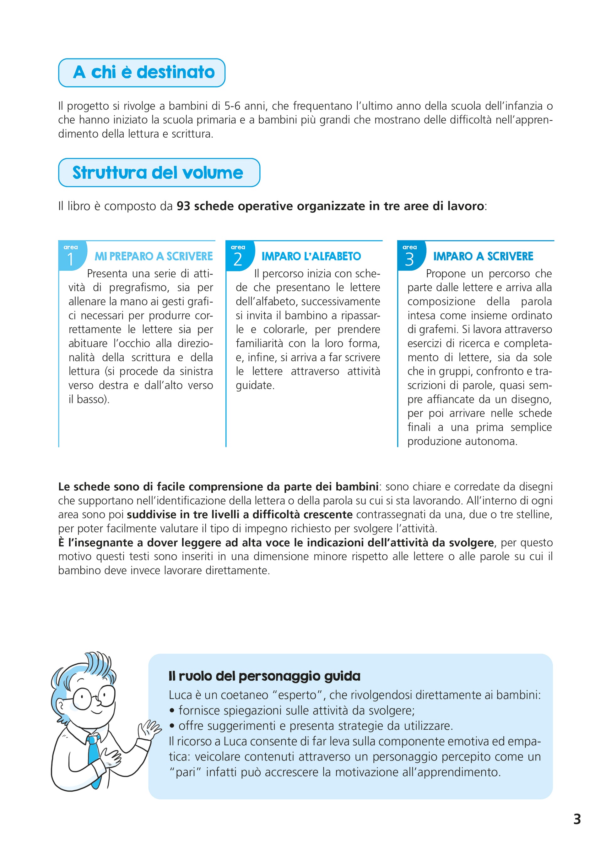 Il volume permette di impostare attività di avvio alla lettoscrittura in modo graduale – a partire dalla fine della scuola dell’infanzia e dal primo anno della primaria – attraverso esercizi su pregrafismo, lettere dell’alfabeto e composizione delle prime parole.