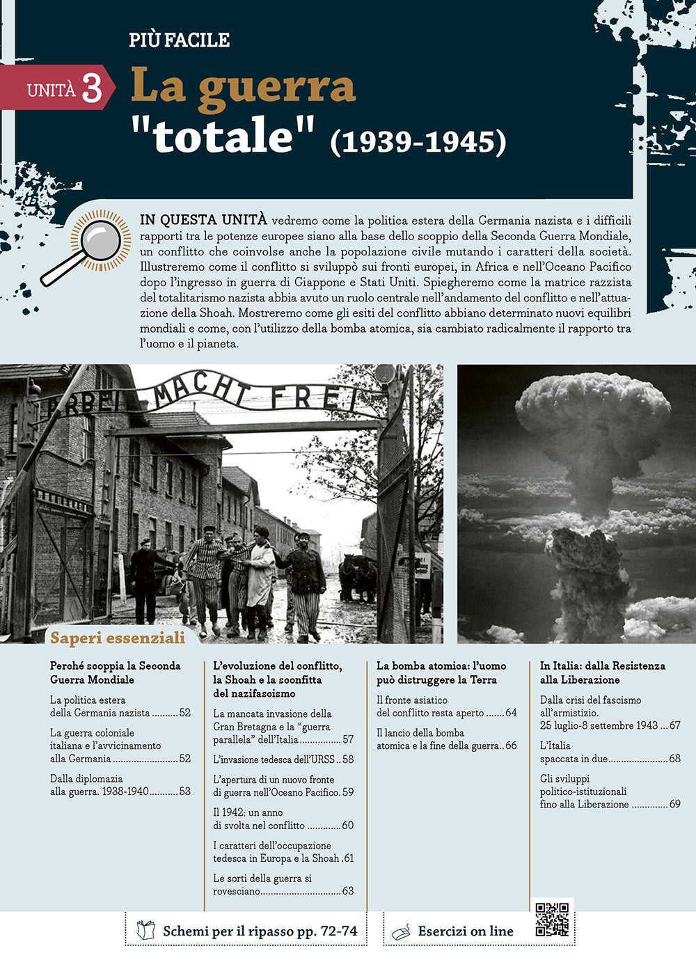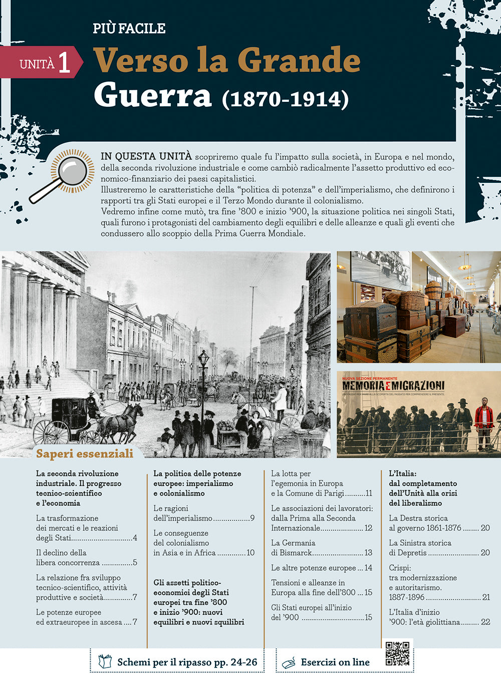 Completa la pubblicazione un’espansione online, richiamabile con QR code, con un’unità aggiuntiva che ci proietta nella contemporaneità, esercizi di autoverifica per mettersi alla prova, approfondimenti e curiosità, una versione digitale delle carte geostoriche e degli schemi per il ripasso, da stampare e avere sempre con sé.