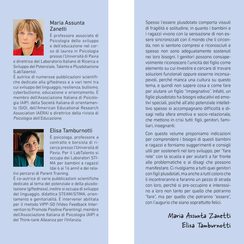 soluzioni funzionali oppure esserne inconsapevoli, perché manca una cultura su questo tema, e quindi non sapere cosa e come fare per aiutare un figlio “impegnativo”. Infatti, un figlio plusdotato ha bisogni educativi ed emotivi speciali, poiché all’alto potenziale intellettivo spesso si accompagnano difficoltà e disagi nella sfera emotiva e socio-relazionale, che mettono in crisi tutti: figli, genitori, familiari, insegnanti. Con questo volume proponiamo indicazioni per comprendere i bisogni di questi bambini e ragazzi e forniamo suggerimenti e consigli utili per sostenerli nel loro sviluppo, per “fare rete” con la scuola e per aiutarli a far fronte alle problematiche e ai disagi che possono manifestare. Ci rivolgiamo a tutti quei genitori con figli plusdotati, ma anche a tutti coloro che li incontreranno e faranno un pezzo di strada con loro, perché si pre-occupino e interessino a loro non tanto per quello che potranno “fare”, ma per quello che potranno “essere”, con l’augurio che siano soprattutto felici."